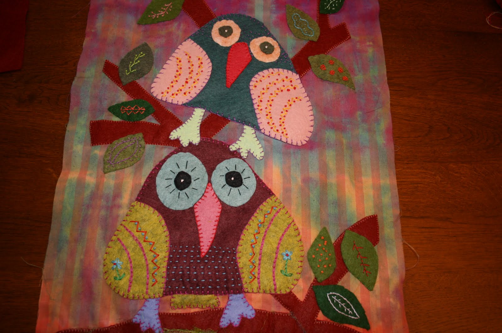 je commence par faire tout les appliqués, comme un fond, maintenant, je vais travailler la décoration par la broderie et des petits appliqués, enfin, en quiltant, je travaillerais encore le tout par des couleurs de fil et des motifs de quiltage différents, je vous montrerais au fur et à mesure.
